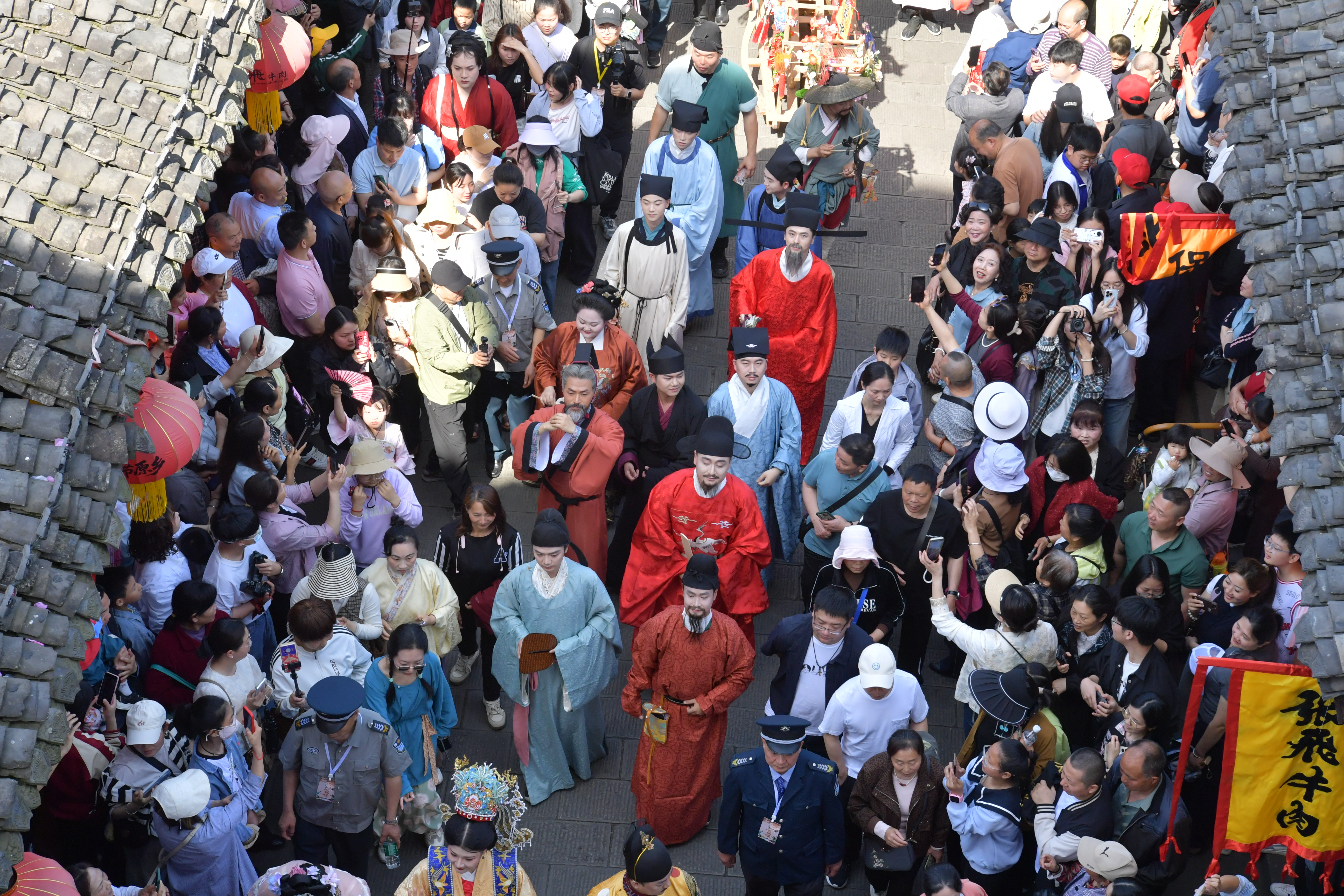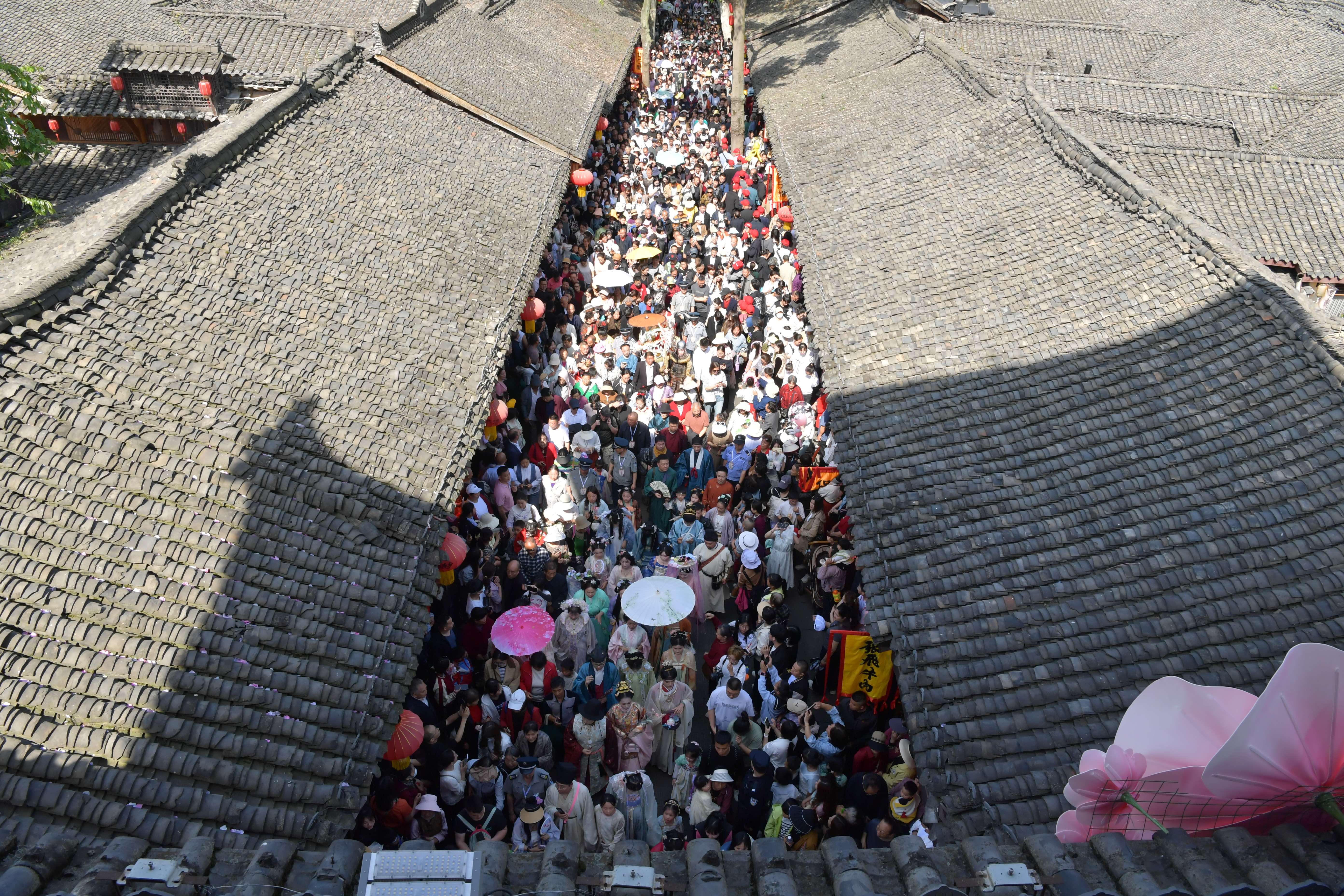 10时整,盛大主题巡游启幕。36位汉服NPC与近万名同袍组成方阵,霓裳华服与青瓦古巷相映成趣。十二花神会、武将仪仗队、国色阆中巡游队三大主题花车鱼贯登场,绘就流动国风长卷。